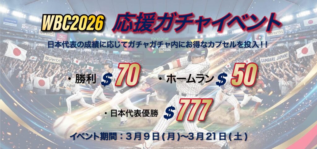 さて、先日までオリンピックが開催されておりましたが 次はこれ! WBC2026! はい、最強日本がまた勝つんでしょうかねー。 どうなんでしょうか。 そんなWBCでまたまた日本応援企画やっちゃいます! 日本が勝ったり ホームラン打ったりすると、店内のガチャ...